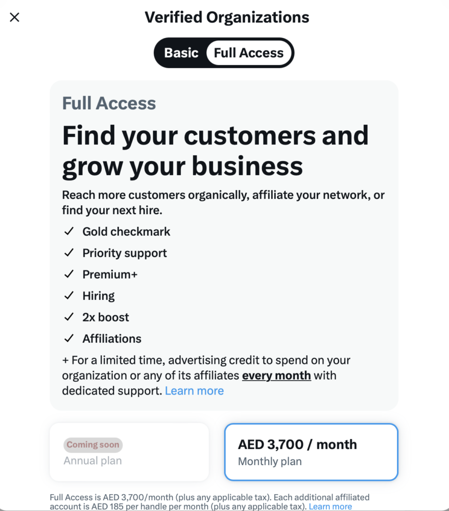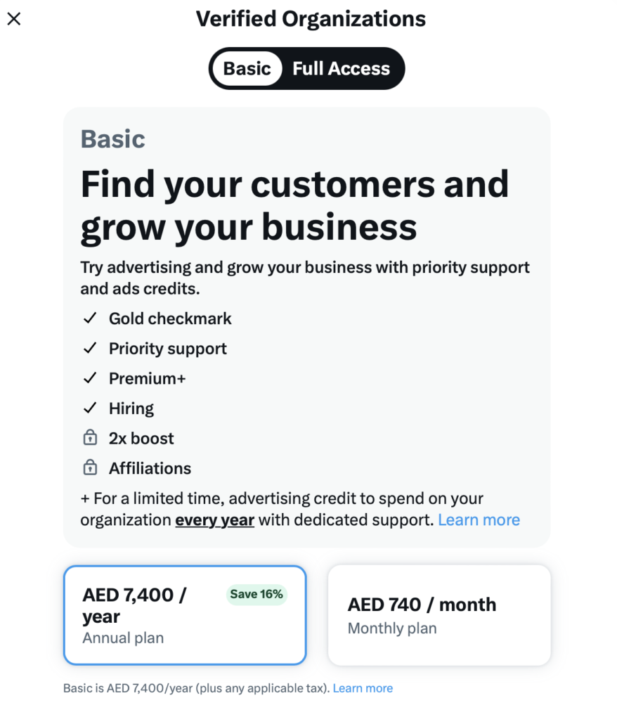 X, previously known as Twitter, has rolled out a new basic tier for Verified Organizations. The new basic’ tier plan is priced at $200 (AED 740) per month or $2,000 (AED 7,400) annually, as opposed to the previous premium priced at $1,000 (AED 3,700) per month for full premium access.