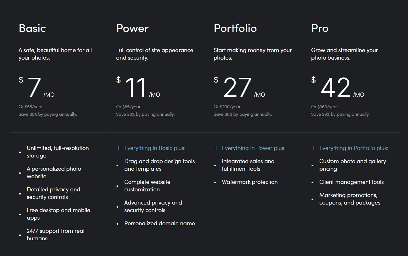 This website is a known name among photographers and has been around for a while. Apart from backing up photos, it also offers you an option to make your own website which is like a portfolio and you can host it on smugmug itself. It offers various privacy and sharing options for your photos and there’s quite a bit that you can do on the backend. It offers various pricing plans based on the features. I tried using this for a few weeks. I shared some albums and it seemed to work fine. I started backing up my photos here. After a few days, I was checking the links which I shared and these had stopped working. I tried checking the album settings and nothing had been changed. There were too many options though, and the interface seemed a bit finicky. The way to share an album with a link didn’t seem too straightforward.